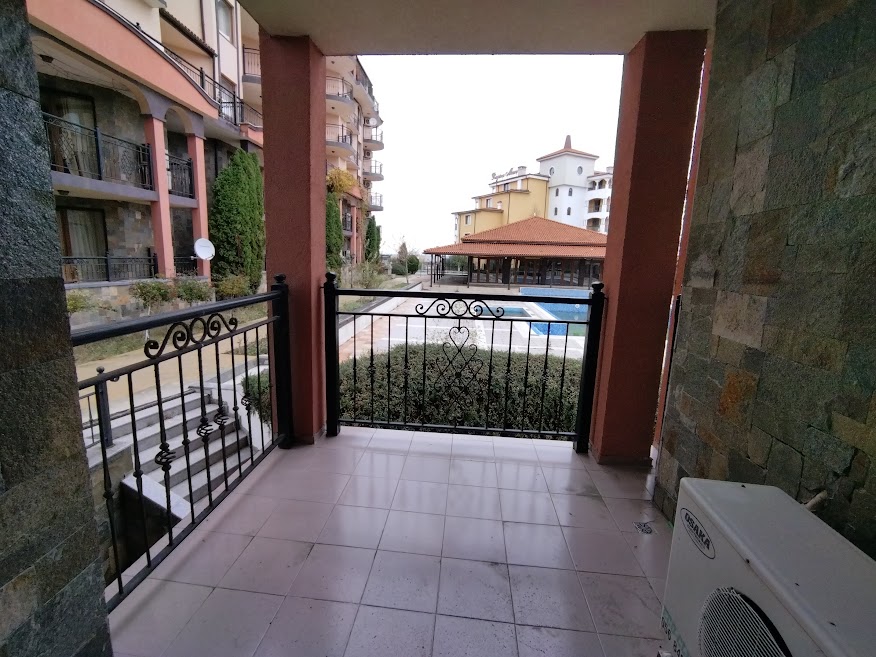 Апартаментът се състои от антре, много голяма дневна с кухненски бокс, спалня, санитарен възел с вана и просторна тераса с гледка към басейна и морето. Продава се с цялото налично обзавеждане и оборудване.