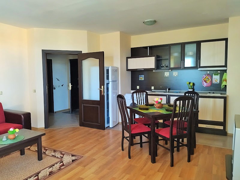 Състои се от антре, дневна, спалня, санитарен възел и просторна панорамна тераса. Продава се напълно обзаведен и оборудван. Отстояние от плаж 100 м.