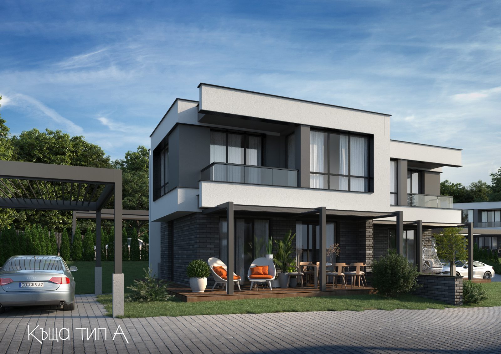 Къщи тип „А“ представлява две къщи разположени в едно УПИ, на сключено застрояване. В разгънатата застроена площ не се включва просторната веранда с невероятен изглед към морето. Всяка къща се придобива заедно със съответния самостоятелен парцел, с изключение на къщи тип „А“. В парцела на всяка къща има предвидено паркомясто и се обособява двор с площ от 222 кв.м. до 364 кв.м. Поради денивелацията на терена, комплекс морски вили SONATA Sea Villas е проектирано терасовидно и от всяка къща ще се откриват невероятни панорамни гледки към морето.