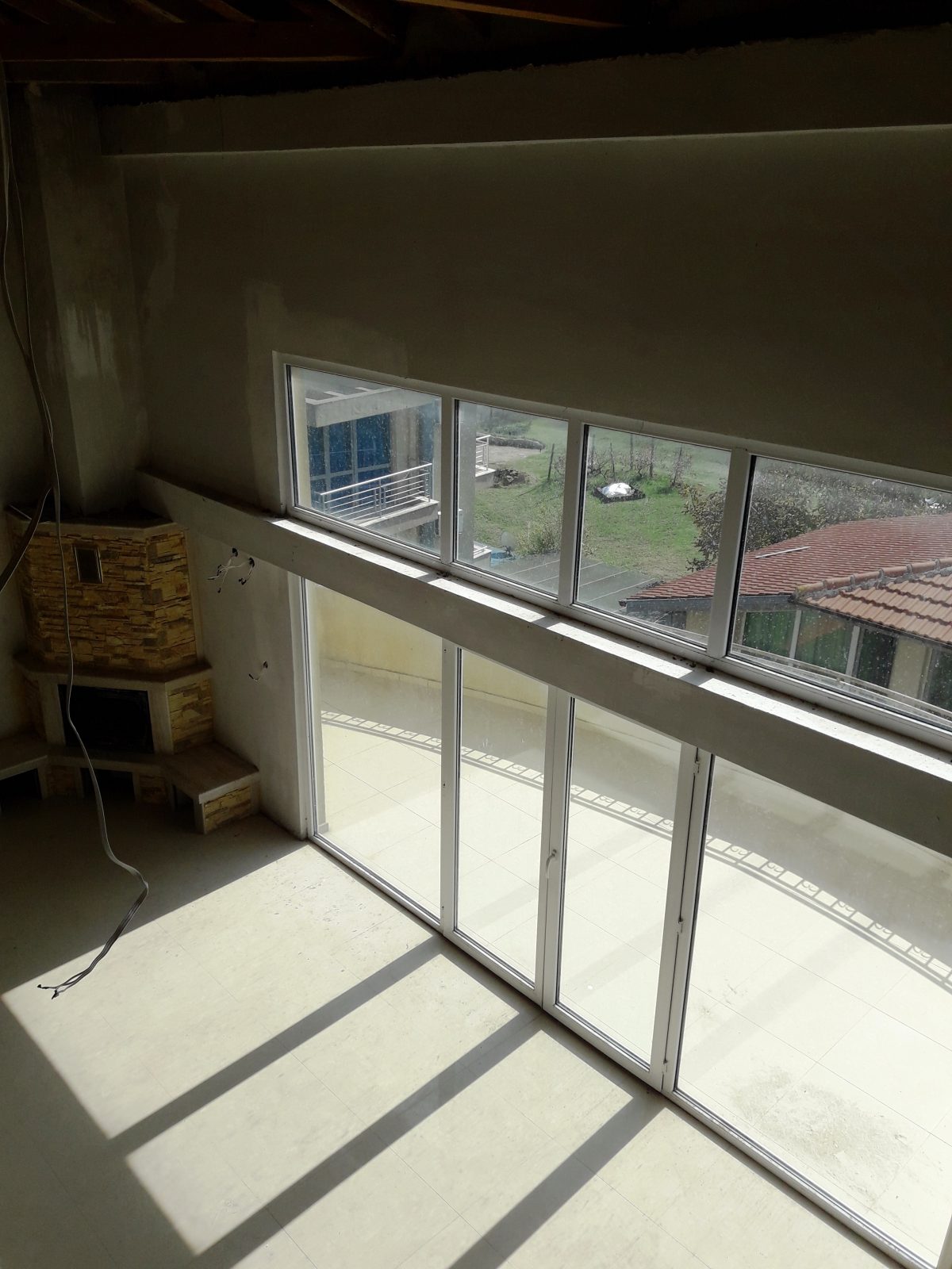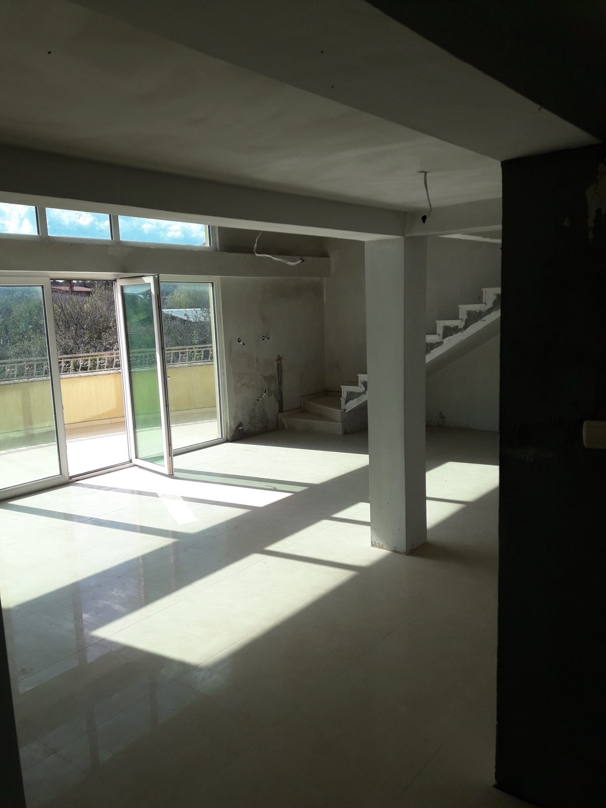Първо ниво – антре, просторна дневна с изводи за кухненски бокс и изградена вътрешна камина, много голяма тераса, санитарен възел и още две по-малки тераси.